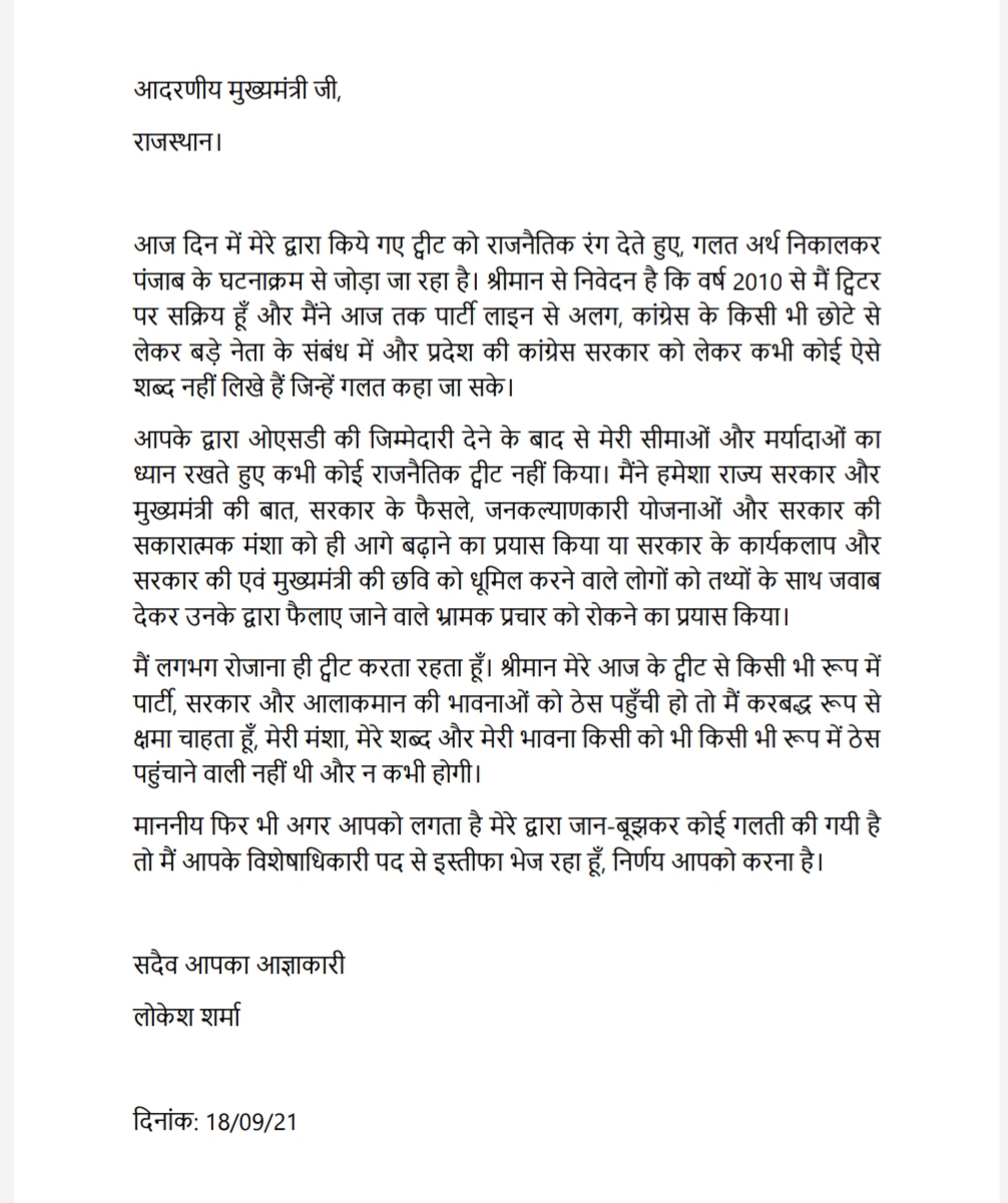 जयपुर। राजस्थान के मुख्यमंत्री अशोक गहलोत के OSD लोकेश शर्मा के शनिवार देर रात इस्तीफा दे दिया। उन्होंने अपने इस्तीफे का पत्र मुख्यमंत्री अशोक गहलोत को भिजवा दिया है। साथ ही मीडिया के साथियों को भी खुद उसकी कॉपी भेजी है। अब इस पर अंतिम निर्णय मुख्यमंत्री अशोक गहलोत को करना है। बताया जा रहा है कि कुछ ट्वीट ऐसे किए गए थे जिनको लेकर लोकेश शर्मा से सवाल जवाब हुए या उनकी कार्यशैली पर प्रश्न उठाए गए, जिससे आहत होकर उन्होंने इस्तीफा दिया है।