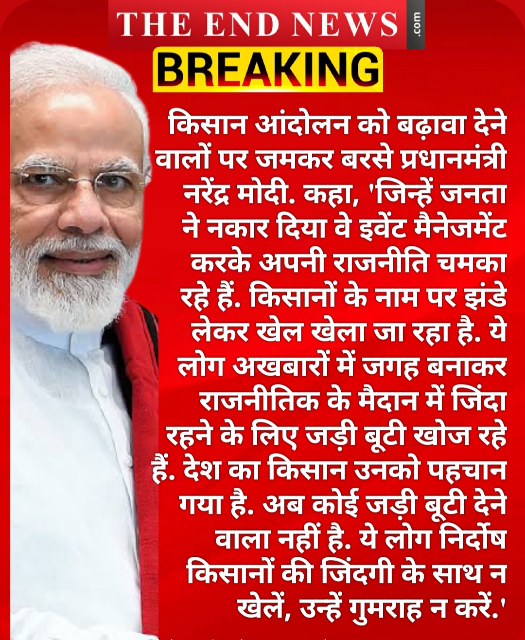 9- पीएम मोदी ने कहा, 'किसानों के नाम पर झंडे लेकर खेल खेला जा रहा है अब उनको यह सच सुनना होगा. ये लोग अखबारों में जगह बनाकर राजनीतिक मैदान में जिंदा रहने के लिए जड़ी बूटी खोज रहे हैं. देश का किसान उनको पहचान गया है. अब कोई जड़ी बूटी देने वाला नहीं है. ये लोग निर्दोष किसानों की जिंदगी के साथ न खेलें, उन्हें गुमराह न करें.'