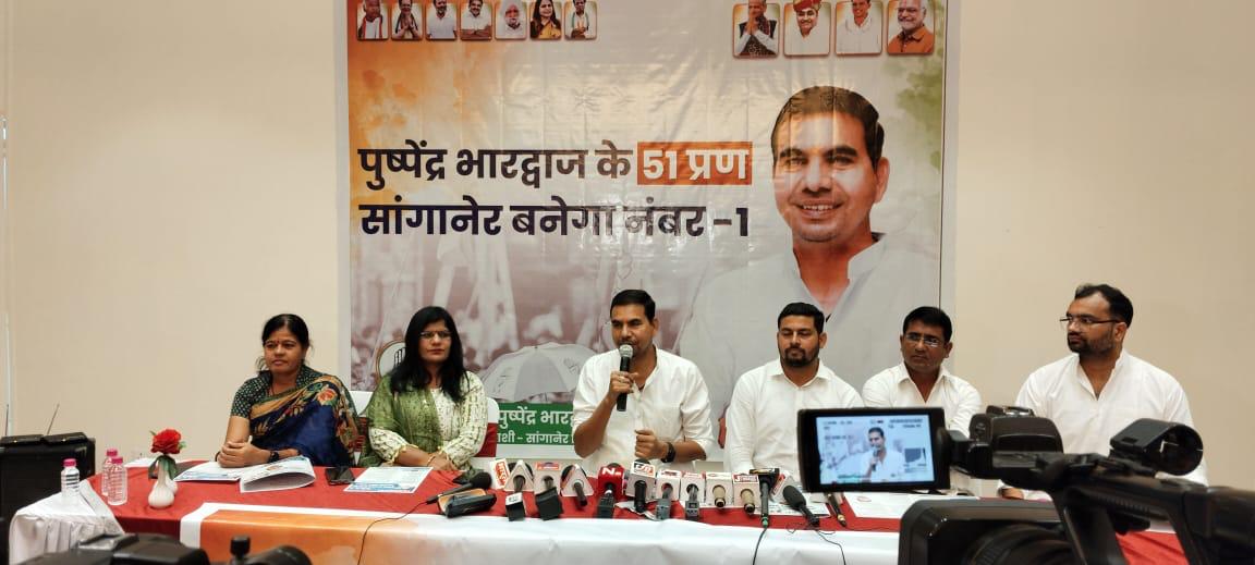 जयपुर। सांगानेर विधानसभा से कांग्रेस प्रत्याशी पुष्पेन्द्र भारद्वाज ने शनिवार को 'पुष्पेन्द्र भारद्वाज के 51 प्रण, सांगानेर बनेगा नंबर वन' घोषणा-पत्र लॉन्च किया। इस दौरान भारद्वाज ने अगले 5 सालों में किए जाने वाले कार्यों को लेकर अपना विजन भी बताया। भारद्वाज ने मीडिया को बताया कि उन्होंने एक माह के दौरान 'जनसेवक आपके द्वार' यात्रा निकाली थी। इस दौरान उन्होंने 410 किलोमीटर की पैदल यात्रा कर 45000 लोगों से मुलाकात की थी, उस दौरान जो लोगों की समस्याएं थीं, उनके आधार पर उन्होंने यह 51 प्रण का घोषणा पत्र बनवाया है। उन्होंने बताया कि इसमें शिक्षा, स्वास्थ्य, रोजगार के साथ ही महिला, युवा और वरिष्ठ नागरिकों के साथ ही मूलभूत सुविधाओं पर फोकस किया है। उन्होंने बताया कि चुनाव जीतने पर वे सांगानेर में सैटेलाइट अस्पताल का तय समय में निर्माण करवाएंगे, विधानसभा में नया जनाना अस्पताल और प्रमुख क्षेत्रों में प्राथमिक स्वास्थ्य केन्द्र खुलवाएंगे। छात्रों के लिए वातानुकूलित पुस्तकालय का निर्माण कराएंगे। वहीं प्रमुख बाजारों और पार्कों में मुफ्त वाई-फाई की सुविधा देंगे। खिलाड़ियों के लिए राज्य स्तरीय स्टेडियम का निर्माण भी कराया जाएगा। कपड़ा व्यापारियों के लिए आधुनिक टैक्सटाइल पार्क बनवाएंगे। महिला आत्मरक्षा के लिए प्रशिक्षण केन्द्र सहित समस्त विधानसभा में सीसीटीवी कैमरे की व्यवस्था भी की जाएगी। विधानसभा में धार्मिक स्थलों का सौंदर्यीकरण और जीर्णोद्वार कराया जाएगा। इसके अलावा सभी कॉलोनियों में बीसलपुर पेयजल लाइन, सीवर लाइन, सीतापुरा से अजमेर गेट तक मेट्रो लाइन का विस्तार, सांगानेर और मानसरोवर में शहरी शहरी बस सेवा सहित कई विकास के कार्य कराए जाएंगे। भारद्वाज ने बताया कि पूरे 5 साल की सक्रियता के चलते उन्हें गली गली की समस्याएं पता है और 5 दिन पहले सांगानेर आए भजनलाल को गलियों का भी नहीं पता।