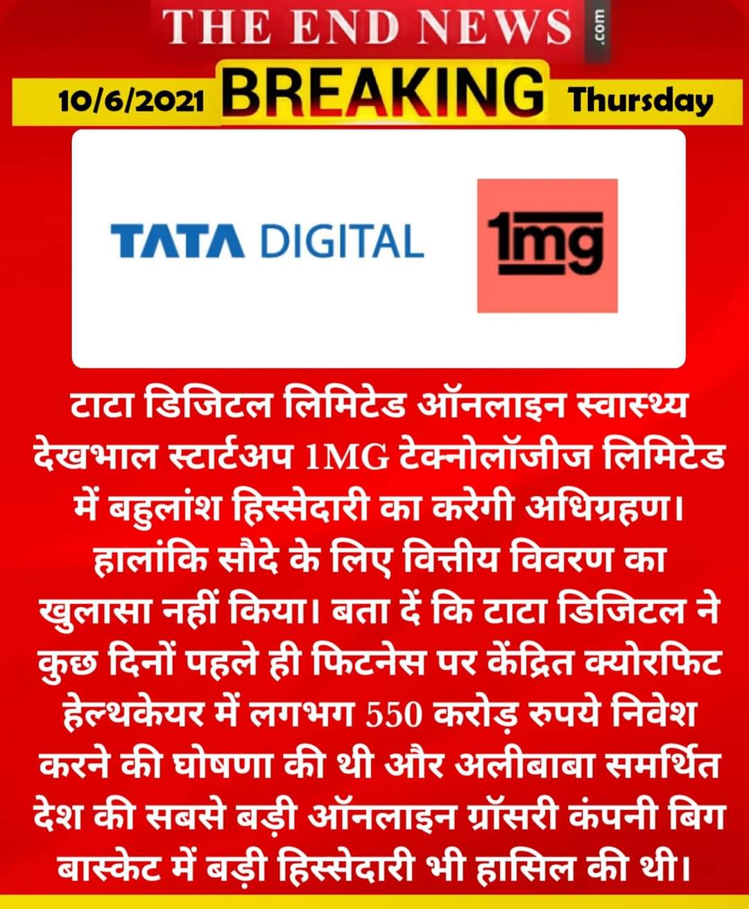 बता दें कि टाटा डिजिटल ने कुछ दिनों पहले ही फिटनेस पर केंद्रित क्योरफिट हेल्थकेयर में लगभग 550 करोड़ रुपये निवेश करने की घोषणा की थी और अलीबाबा समर्थित देश की सबसे बड़ी ऑनलाइन ग्रॉसरी कंपनी बिग बास्केट में भी बड़ी हिस्सेदारी हासिल की थी। वैसे 1mg के अधिग्रहण को टाटा ग्रुप के लिए काफी महत्वपूर्ण इसलिए भी माना जा रहा है क्योंकि कुछ समय पहले रिलायंस इंडस्ट्रीज ने ऑनलाइन फार्मेसी सेगमेंट में कदम रखा था और नेटमेड्स का अधिग्रहण किया था। जबकि फार्मईजी का मेडलाइफ में विलय हो चुका है।