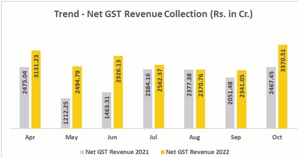 भारत सरकार द्वारा जारी आंकडो के अनुसार संपूर्ण देश में माल एवं सेवा कर का माह अक्टूबर-2022 में कुल नकद संग्रह 151718 करोड रूपये दर्शाया गया है। जिसमें कुल वृद्धि 18 प्रतिशत एवं राजस्थान राज्य में 10 प्रतिशत की वृद्धि दर्शायी गई है। यह राज्य में माल एवं सेवा के उत्पादन, सृजन तथा मूल्य वृद्धि को परिलक्षित करता है।